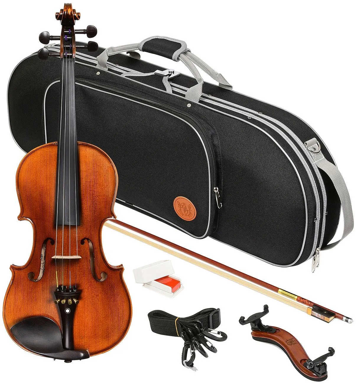 При работе были использованы только качественные материалы. Это сделало скрипку обладательницей уникального чистого звука. Верхняя дека этого инструмента изготовлена из массива резонансной ели, а нижняя дека и обечайки - из волнистого клёна, поэтому извлекаемый звук отличается глубиной и резкостью. Этот инструмент собран и покрыт лаком вручную. Особенным этот инструмент делает и цвет - золотисто-коричневый с янтарным отливом. На скрипку установлен комплект струн средней жёсткости. Струнодержатель этой модели изготовлен из эбони с инкрустацией, оснащён 4-мя машинками для тонкой настройки струн.