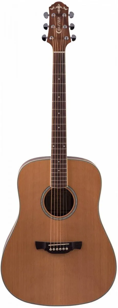 Гитара Crafter D 7/NC во многом похожа на популярную модель D 6 и отличается верхней декой, выполненной из массива красного кедра. Форма корпуса «дредноут» – это, пожалуй, самая популярная форма акустических гитар. Разработанный компанией Martin в 20-х годах прошлого столетия, «дредноут» до сих пор считается стандартом для вестерн-гитар, который с успехом используется большинством производителей и огромным числом музыкантов, играющих в самых различных стилях. Эти корпуса имеют несколько больший размер, чем классические или оркестровые гитары, а звучание имеет явный акцент на низкие частоты.