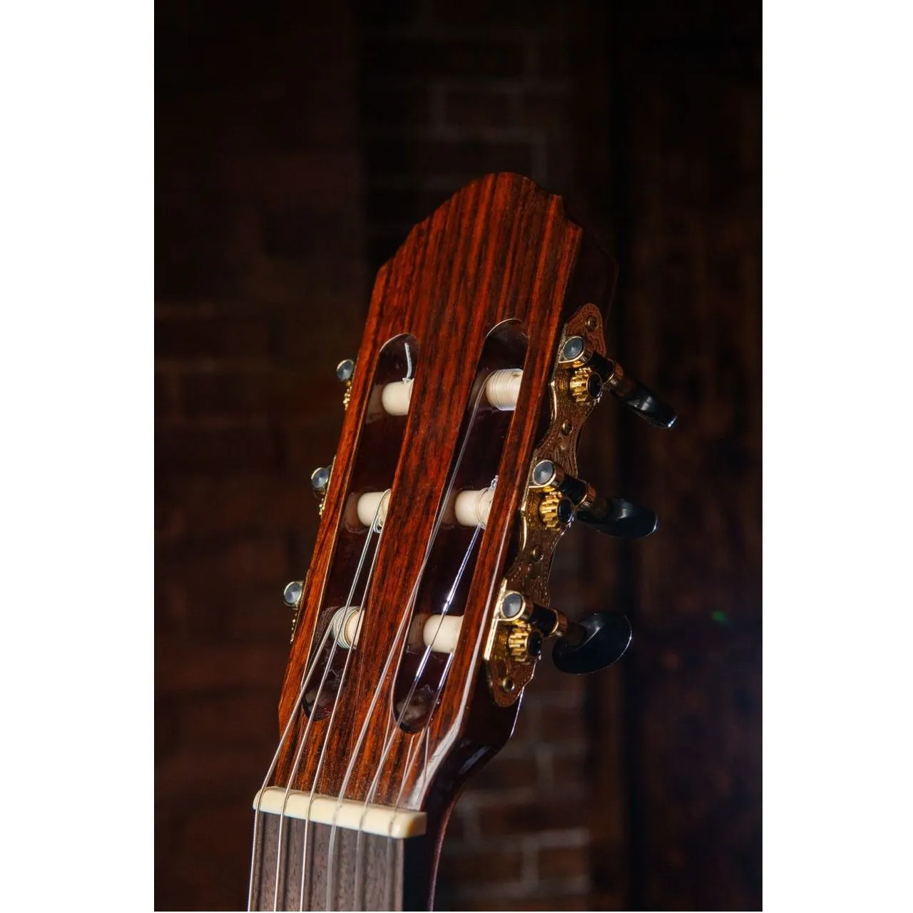 Верхняя дека - кедр. Обечайка и задняя деки - палисандр. Гриф - красно дерево. Мензура 650мм. Ширина порожка 52мм.